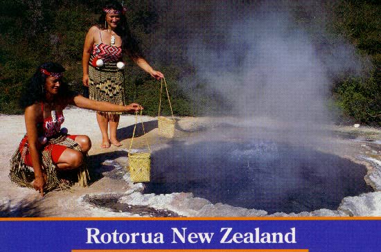![]() Maori women demonstrate cooking in a hot pool at Whakarewarewa Thermal Reserve in Rotorua. |