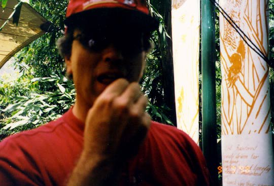 ![]() Ron licking the bottom of a green ant. They release ascorbic acid, which tastes like lemon juice. |
